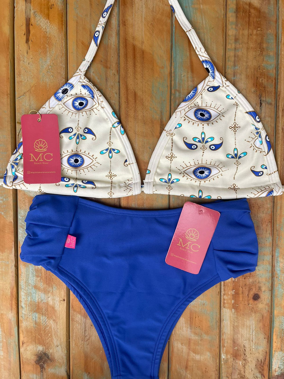 Parte de Cima Top e Calcinha Bombom Cós Alto Olho Grego Azul