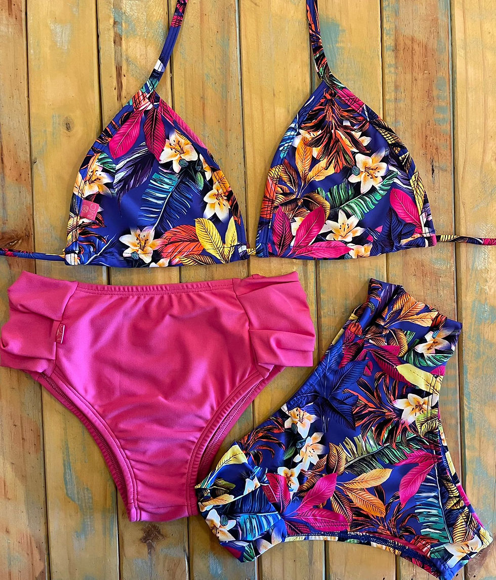 Combo Tomara que Caia Tropical / Preto e Calcinha Bombom Cós Alto Tropi