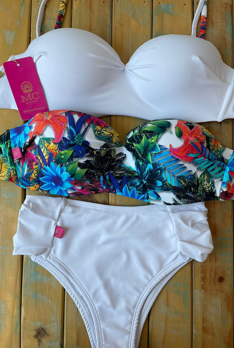 Combo Tomara que Caia Flores / Branco e Calcinha Bombom Cós Alto Flores