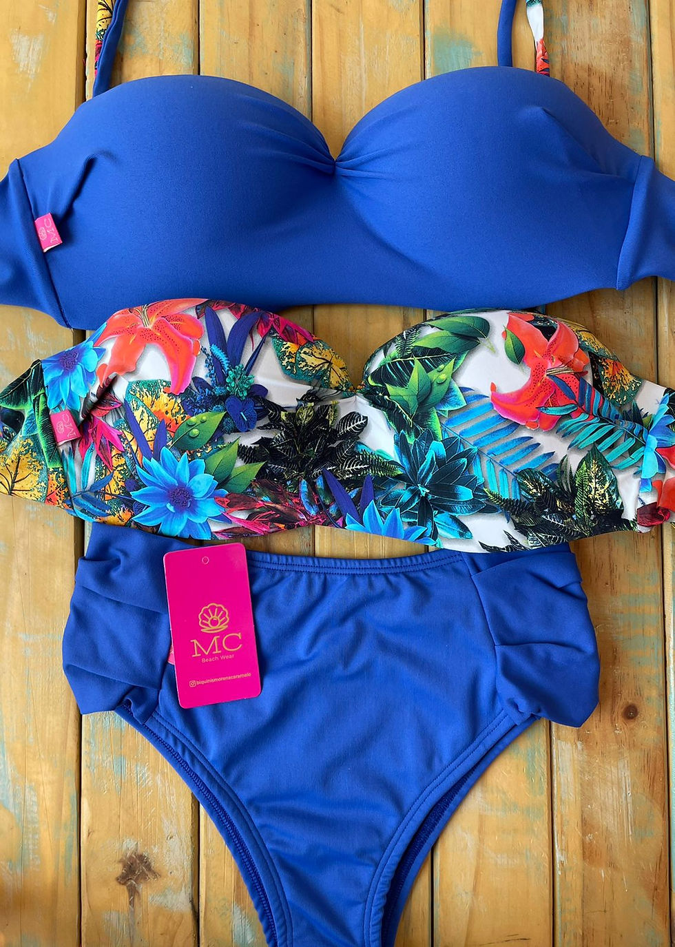 Combo Tomara que Caia Azul Royal / Flores e Calcinha Bombom Cós Alto Azul Royal
